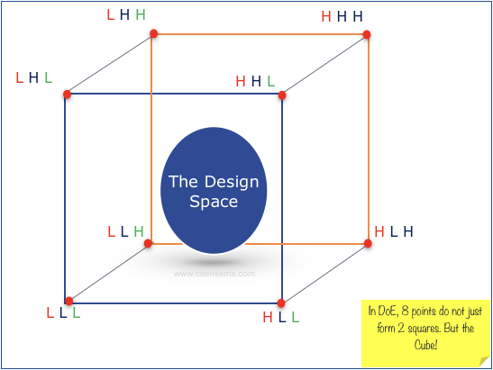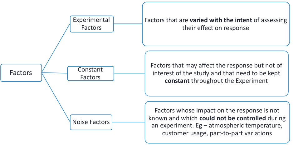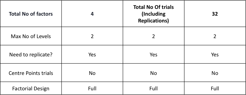 We already saw the shortcomings of this traditional experimentation model. Hence, we use the Design of Experiments (here, we discuss the basic model in DoE – the Full Factorial Model). DoE helps us to design the experiments with a minimum number of trials providing maximum insights. It reduces the impacts of human bias, unknown environmental factors (also called as Lurking factors) by adopting the concepts of replication and randomisation.