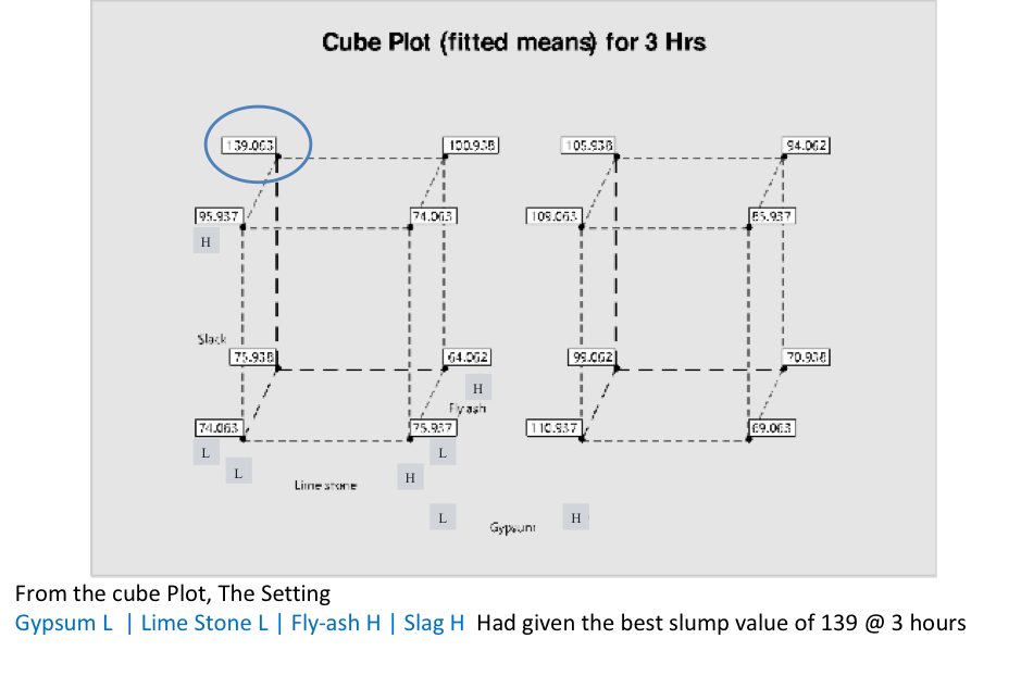 Further, we planned designs for the second experiment with the chemical properties and then the concrete mix in the third set of trials. We have got better results in both the experiments. The parameters were reconfirmed with confirmation trials and their level was standardised.