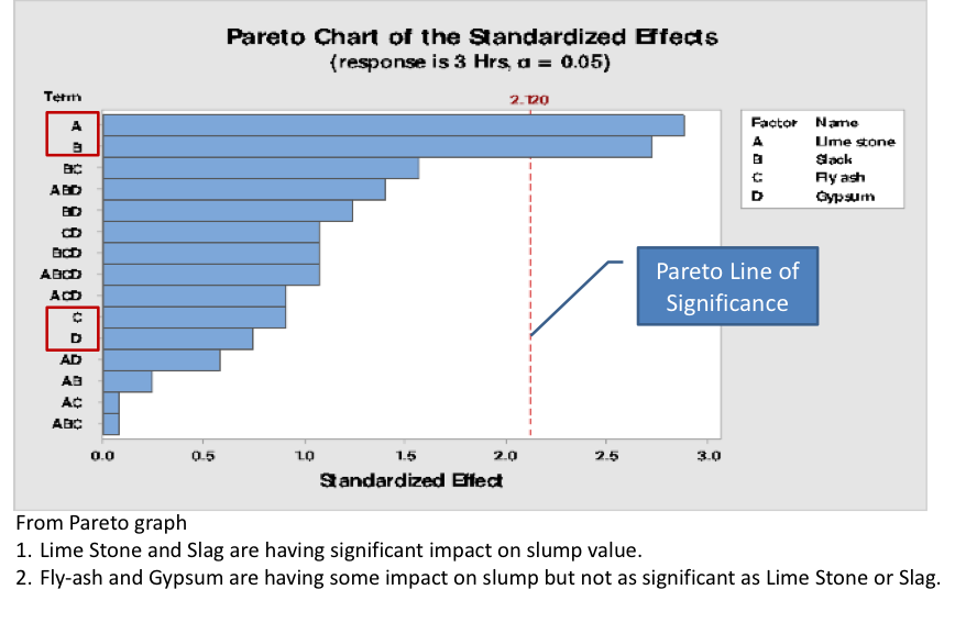 Based on the response data collected, we have got the following findings. The final derived Pareto Chart (the initial chart is given in the picture) of DoE showed that components A and B were having a significant impact on the slump property whereas components C and D were not having a similar impact.