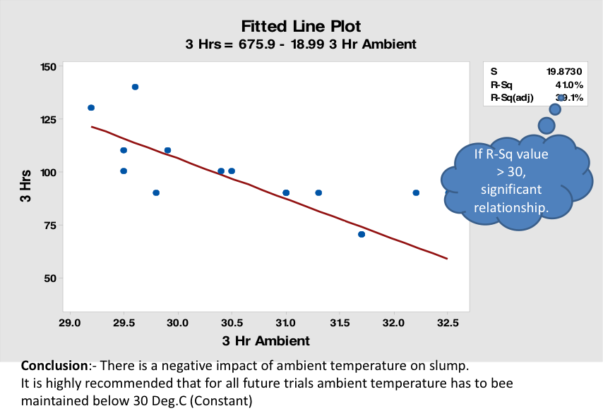 Most importantly, we found out the negative impact of ambient temperature on the slump property. This was the clue I got from observing the data of noise factors and corresponding response readings. I suspected that whenever the ambient temperature is higher, the outcome was lower than expected. We have conducted a regression analysis which confirmed the same.