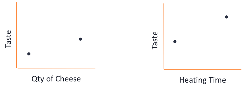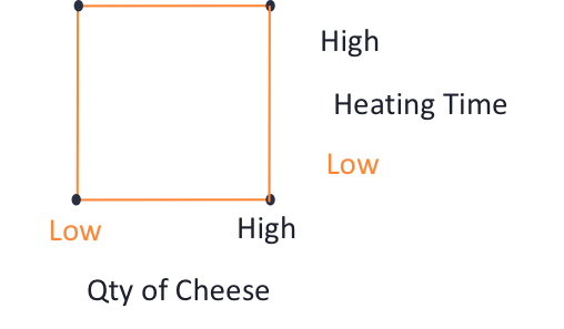 The beauty of DoE is in the statistical interpretation of the results. Consider an example of making pizzas. Will take 2 factors – Quantity of cheese added, and time of heating determines the taste.