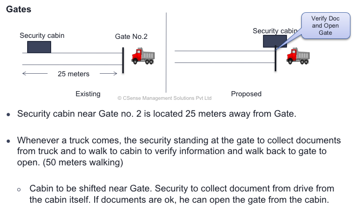 - The security manager came out with a proposal to shift the Gate 2 cabin to reduce 50 meters of his security personnel to collect documents from each truck.