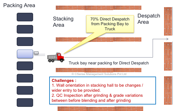 The breakthrough was an idea of ‘direct despatches’ from packing. They had space for trucks to come in. While analysing their monthly production and despatches data, We found that 70% of the materials despatched in one month matches with their monthly production plan. If they could plan a bit more in detail, they could accommodate 50 to 60% of their total production in direct despatches. So They could eliminate the need for stacking, transporting through the forklifts and unstacking and the entire cycle for despatch.