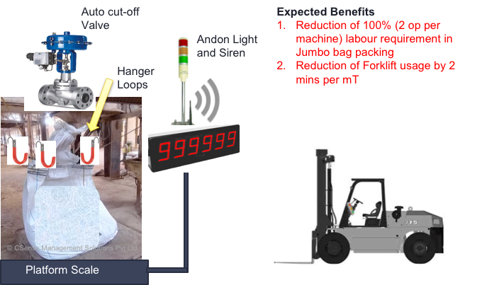 One-ton bag packing section proposed to use hooks instead of tying ropes and an andon system with a weighing balance.