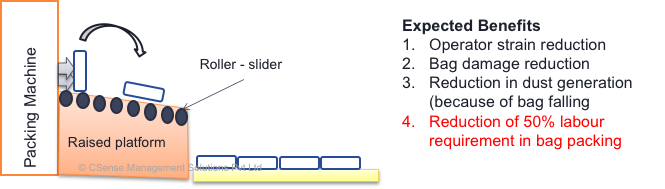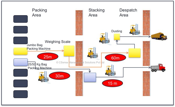 The one-ton bags were moved 85 meters on an average from packing machine to despatch. The bags were handled 11 times in their journey. The smaller bags travel a total of 45 metres and touched 9 times between packing to despatch.