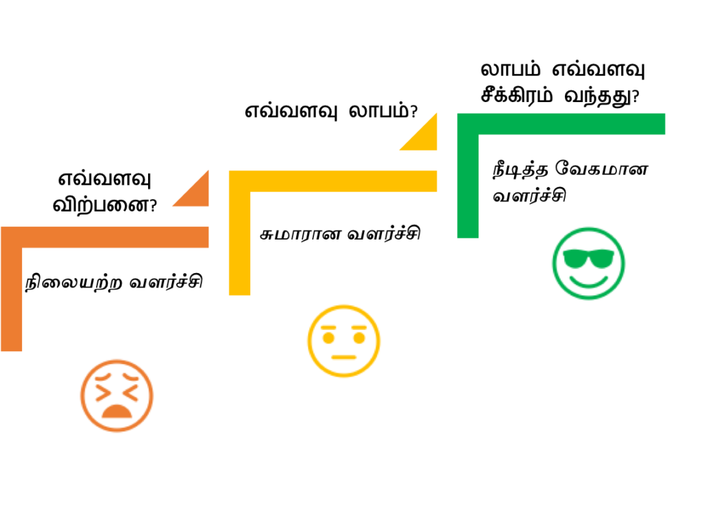 இங்கு மிகப்பெரிய சவால், வியாபாரத்தைப் பற்றிய நமது தவறான கண்ணோட்டம். வியாபாரத்தில் ‘எவ்வளவு விற்பனையானது?’ என்று மட்டும் பார்த்தால் அது முதல் படி – இந்த நிறுவனம் நிலையான வளர்ச்சி பெறாது. எவ்வளவு லாபம் வந்தது என்று பார்ப்பது இரண்டாவது படி. அந்த லாபம் எவ்வளவு சீக்கிரம் வந்தது என்று பார்ப்பதே மூன்றாவது படி.