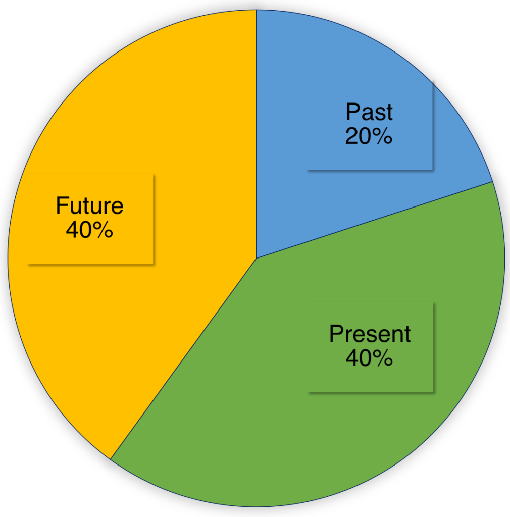 இதில் ஒரு நிறுவனராக எந்தக் காலத்தில் எவ்வளவு நேரம் செலவிட வேண்டும்? இதற்கு இதுவரை எந்த ஆய்வும் நடத்தப்படவில்லை என்று நினைக்கிறேன். இதுபோல் நான் மூன்று காலமாகப் பிரித்தே 2 வருஷம் தான் ஆகிறது. எனவே, இதில் ஆராய்ச்சி நடந்திருக்க வாய்ப்பு இல்லை. ஆனால், நடைமுறை அடிப்படையில் பரிந்துரைப்பது – 40% நேரம் நிகழ்காலத்திழும், 40% நேரம் வருங்காலத்திலும் மீதமுள்ள 20% நேரம் கடந்தகாலத்திலும் செலவிடவேண்டும்.