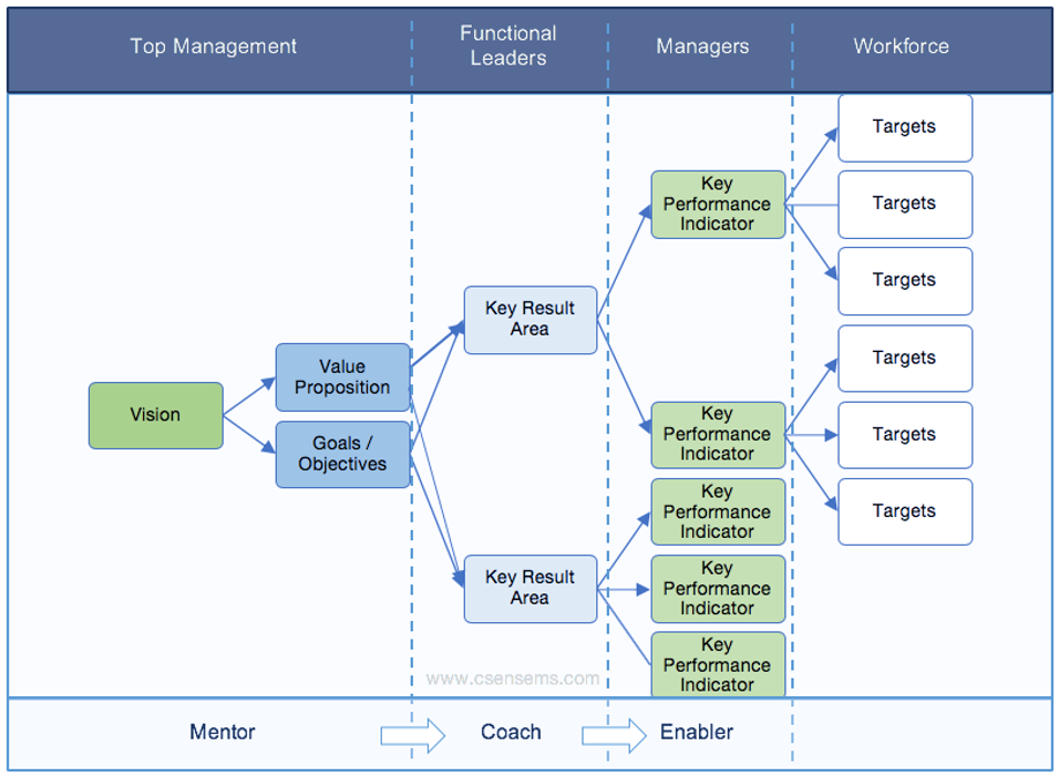 இவ்வாறே, மேலே இருக்கும் துறைத் தலைவர், அவரது அனைத்து மேலாளர்களும் அவர்களது KPI ஐ அடைவதற்கு பொறுப்பாகிறார். ஒரு மேலாளர், அவரது சகாக்கள் தங்களது தினசரி இலங்குகளை அடைவதற்குப் பொறுப்பாகிறார்.